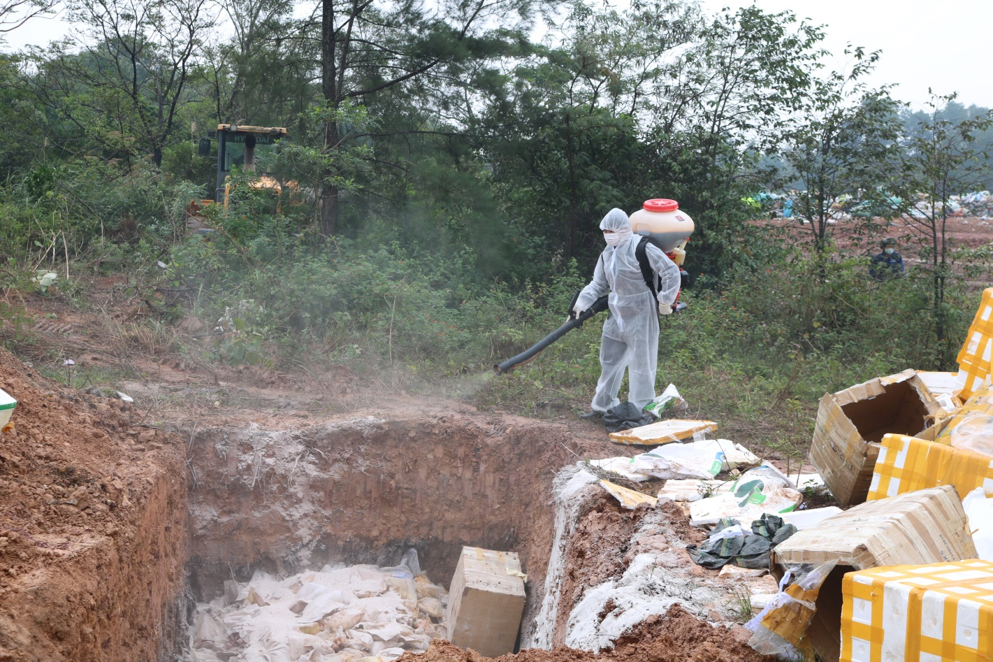 Hình thức tiêu hủy đối với toàn bộ tang vật là cho toàn bộ sản phẩm động vật xuống hố đã đào sẵn, rắc vôi bột, lấp đất, nén chặt và phun dung dịch Clorin