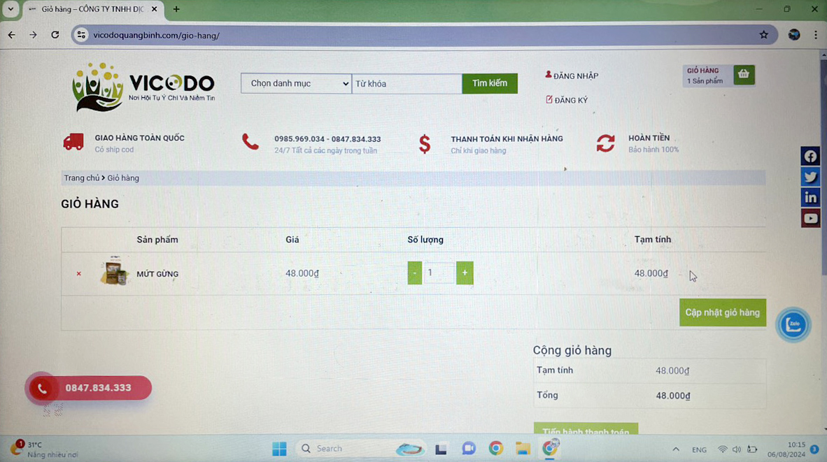 Trước đó, vào ngày 06/8/2024, Đoàn kiểm tra Đội Quản lý thị trường số 3, Cục Quản lý thị trường tỉnh Quảng Bình tiến hành kiểm tra đối với Công ty TNHH Dịch vụ V.C.D có địa chỉ tại thôn Đông Hưng, xã Quảng Đông, huyện Quảng Trạch, tỉnh Quảng Bình. Qua kiểm tra phát hiện website: https://vicodoquangbinh.com của Công ty đang hoạt động và bán thực phẩm các loại, trên website này có chức năng đặt hàng trực tuyến, có đầy đủ thông tin về giá cả, phương thức thanh toán của hàng hóa. Bà N.T.N - Chủ tịch Công ty kiêm Giám đốc của Công ty TNHH Dịch vụ V.C.D thừa nhận website: https://vicodoquangbinh.com thuộc sở hữu của Công ty TNHH Dịch vụ V.C.D, được thiết lập để phục vụ hoạt động bán hàng trực tuyến cho Công ty.