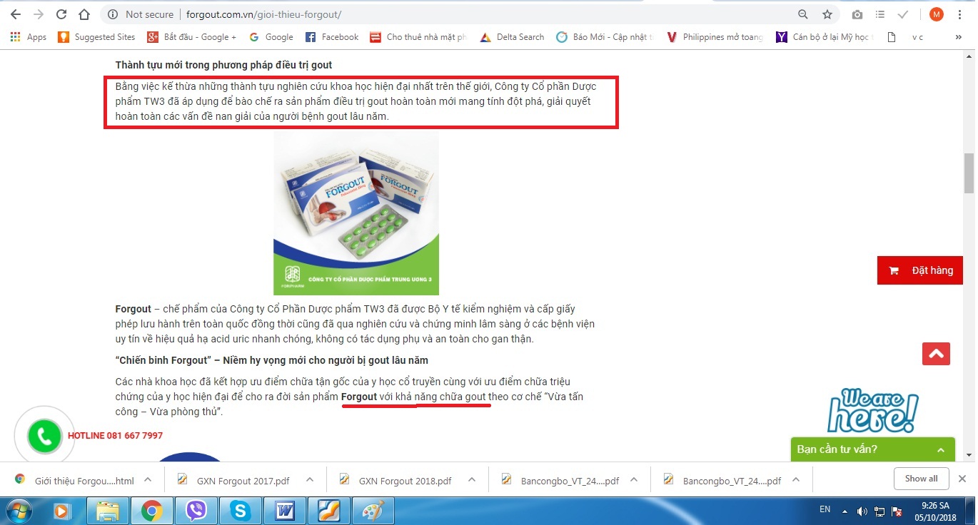 | Được cấp phép quảng cáo là có tác dụng “hỗ trợ hạ acid uric” nhưng trên Facebook và trên trang web http://forgout.com.vn thực phẩm chức năng Viên nén bao phim FORGOUT của Dược phẩm Trung ương 3 lại được coi như “thần dược” trong điều trị bệnh Gout với những ngôn từ mỹ miều “sản phẩm điều trị gout hoàn toàn mới mang tính đột phá giải quyết hoàn toàn các vấn đề nan giải của người bệnh gout lâu năm” |