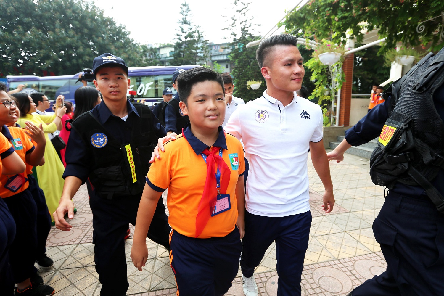 Quang Hải vui vẻ bước vào cùng các em học sinh