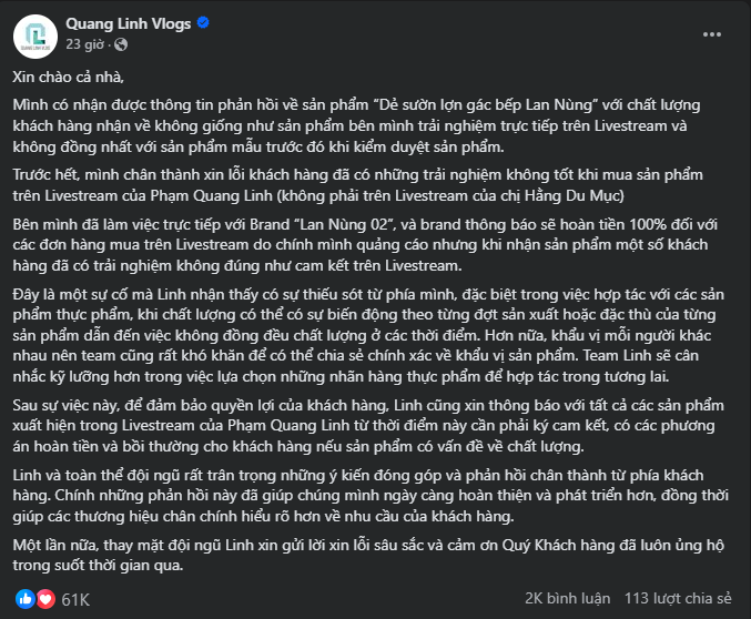 Quang Linh cho biết: "Mình chân thành xin lỗi khách hàng đã có những trải nghiệm không tốt khi mua sản phẩm trên livestream của Phạm Quang Linh (không phải trên livestream của chị Hằng Du Mục)".