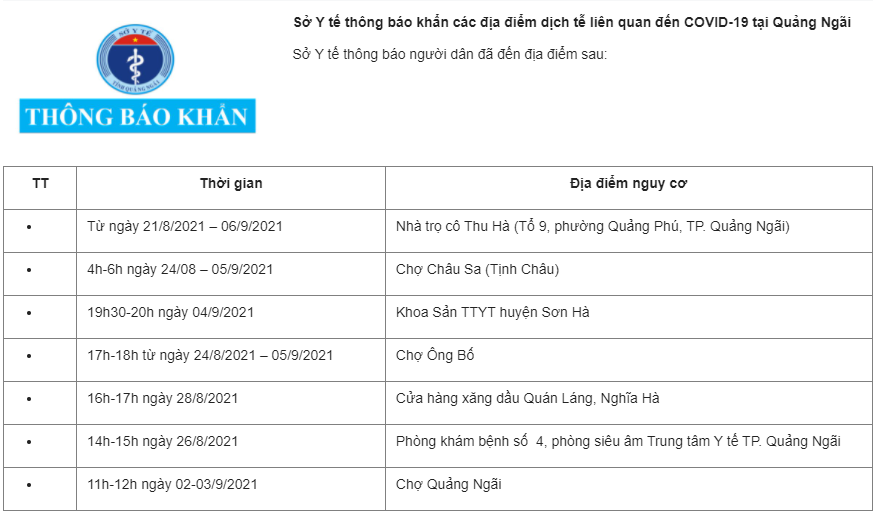 Ngày 8/9, Sở Y tế Quảng Ngãi vừa có Thông báo khẩn số 37 về các địa điểm dịch tễ liên quan đến COVID-19.