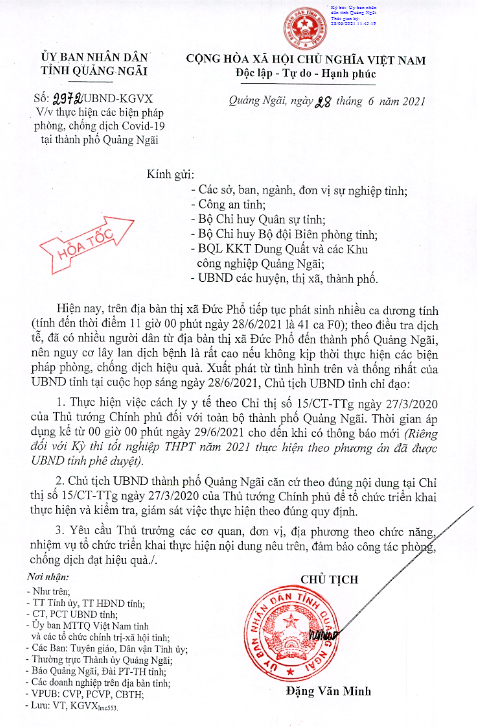 Ngày 28/6, UBND tỉnh Quảng Ngãi và có văn bản hỏa tốc về việc thực hiện các biện pháp phòng, chống dịch COVID-19 tại thành phố Quảng Ngãi.