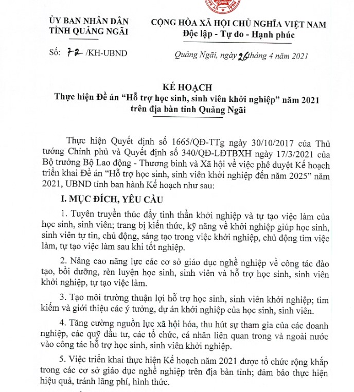 Khởi nghiệp và đổi mới sáng tạo chính là con đường biến ước mơ của bản thân thành hiện thực, đồng thời góp phần hiện thực hóa khát vọng và xây dựng đất nước. Trước nhu cầu thực tiễn, ngày 26/4/2021, UBND tỉnh Quảng Ngãi đã ban hành Kế hoạch số 74/KH-UBND Thực hiện Đề án “Hỗ trợ học sinh, sinh viên khởi nghiệp” năm 2021 trên địa bàn tỉnh.