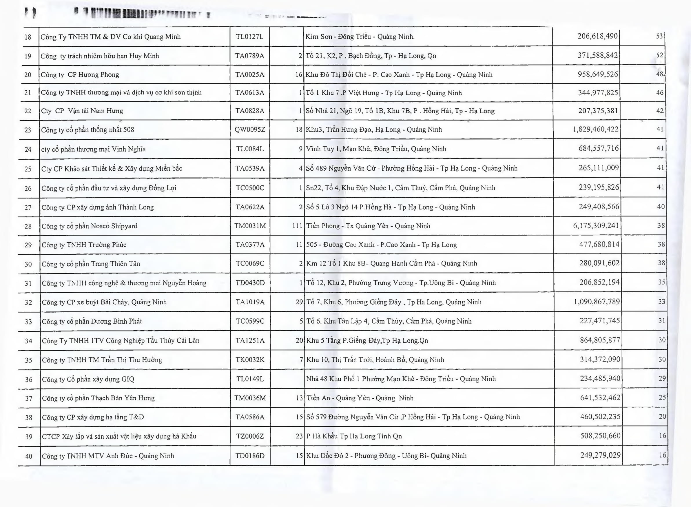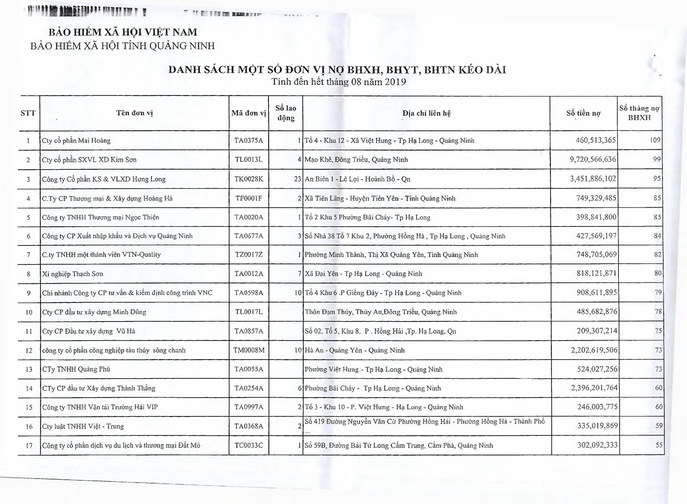 Cụ thể, các đơn vị đều nợ từ 3 đến 109 tháng tiền BHXH, BHYT. Trong đó, đứng đầu danh sách là Công ty CP Sản xuất vật liệu xây dựng Kim Sơn nợ 99 tháng với số tiền hơn 9,72 tỷ đồng. Tiếp đến là Công ty CP Nosco Shipyard nợ 38 tháng với tổng số tiền gần 6,2 tỷ đồng; Công ty CP Khoáng sản và vật liệu xây dựng Hưng Long nợ 95 tháng với số tiền trên 3,45 tỷ đồng; Công ty CP May Quảng Ninh nợ 11 tháng với số tiền trên 3 tỷ đồng…