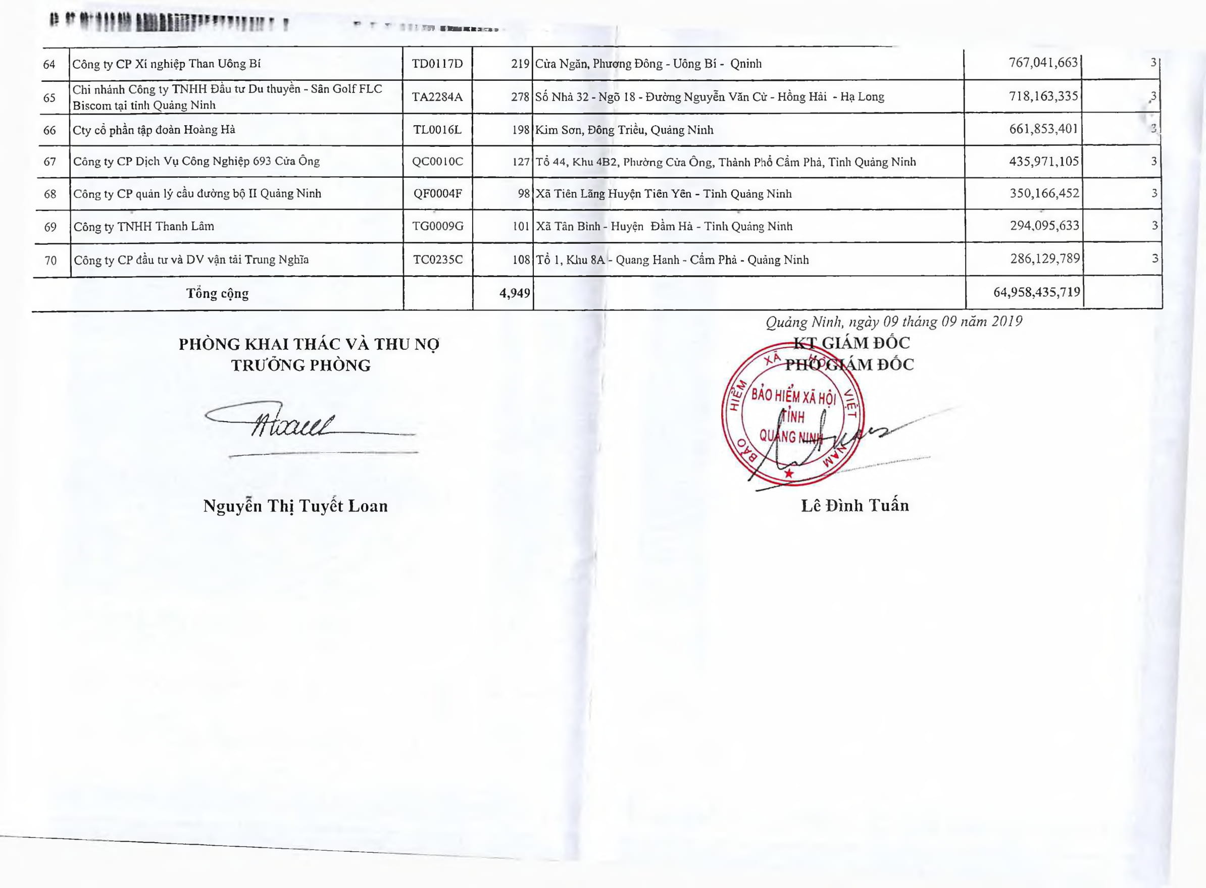 Theo BHXH tỉnh Quảng Ninh, tính đến hết tháng 8/2019, toàn tỉnh có 70 đơn vị chây ỳ, chậm nộp bảo hiểm cho người lao động với tổng số tiền nợ trên 64,95 tỷ đồng.