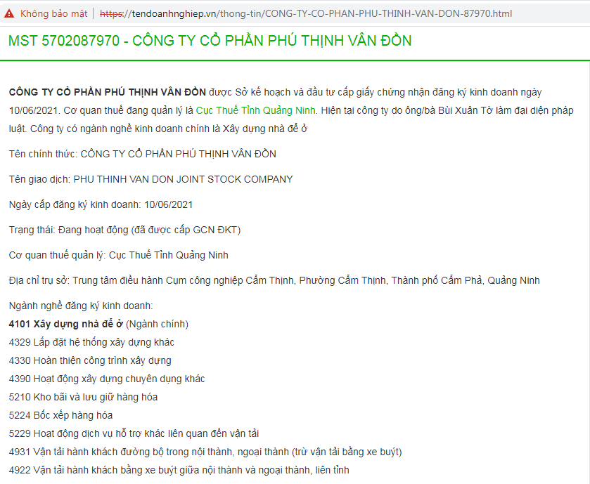 Theo tìm hiểu được biết, Công ty Cổ phần Phú Thịnh Vân Đồn được thành lập ngày 10/6/2021, có địa chỉ tại trung tâm điều hành cụm công nghiệp Cẩm Thịnh, phường Cẩm Thịnh, thành phố Cẩm phả, tỉnh Quảng Ninh. Doanh nghiệp này hoạt động trong lĩnh vực chính là xây dựng nhà để ở.