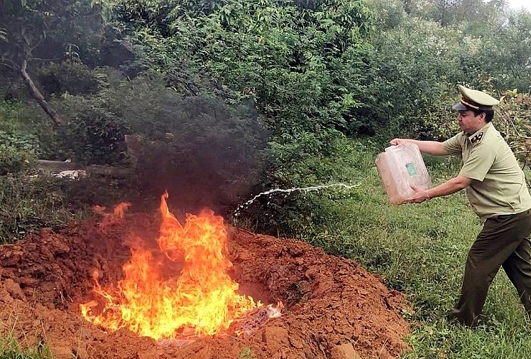 Lực lượng chức năng tiêu hủy hàng hóa vi phạm.