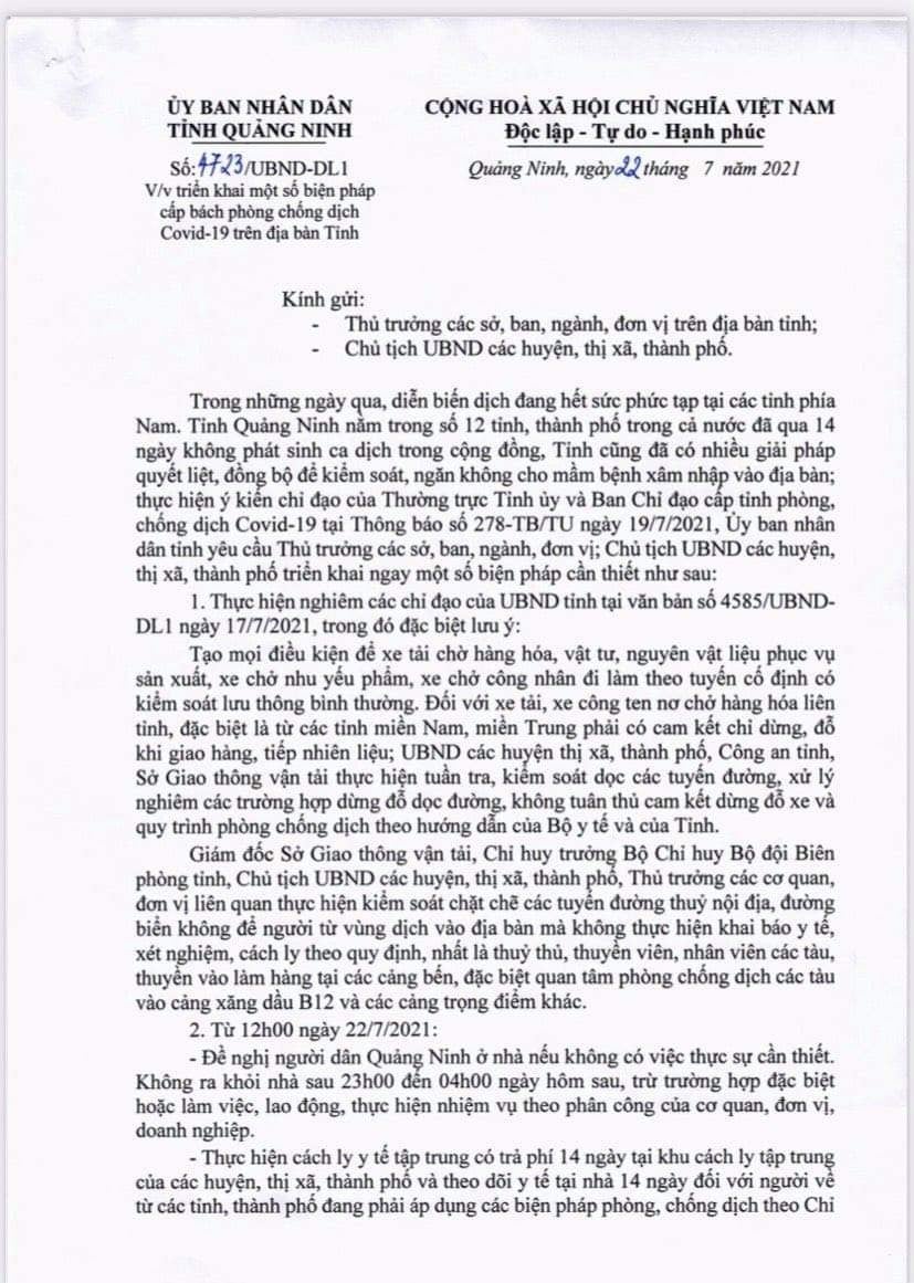 UBND tỉnh Quảng Ninh yêu cầu thủ trưởng các sở, ban, ngành, đơn vị; chủ tịch UBND các huyện, thị xã, TP triển khai ngay một số biện pháp cần thiết, trong đó đặc biệt lưu ý, tạo mọi điều kiện để xe tải chở hàng hóa, vật tư, nguyên vật liệu phục vụ sản xuất, xe chở nhu yếu phẩm, xe chở công nhân đi làm theo tuyến cố định có kiểm soát lưu thông bình thường.