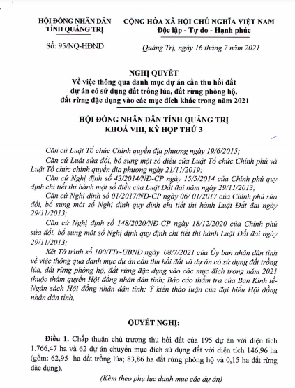 HĐND tỉnh Quảng Trị ngày 16/7 đã ban hành Nghị quyết về việc thông qua danh mục dự án cần thu hồi đất, dự án có sử dụng đất trồng lúa, đất rừng phòng hộ, đất rừng đặc dụng vào các mục đích khác trong năm 2021.