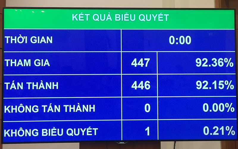 Sáng 10-6, dưới sự điều hành của Phó Chủ tịch Đỗ Bá Tỵ, Quốc hội tiến hành biểu quyết thông qua Nghị quyết về Chương trình giám sát của Quốc hội năm 2020, với 446/447 đại biểu có mặt tán thành, đạt 92,15% tổng số đại biểu Quốc hội.