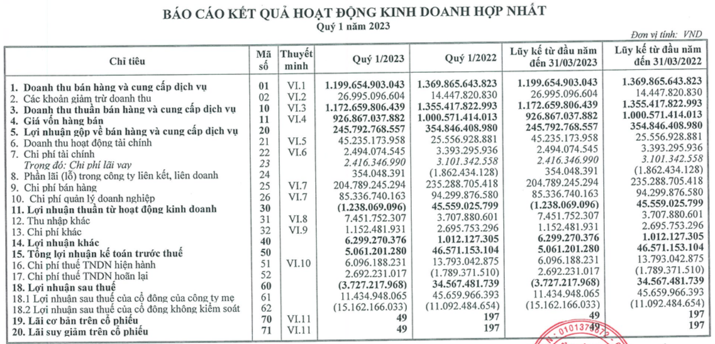 Tổng Công ty cổ phần Bia - Rượu - Nước giải khát Hà Nội (Habeco – mã: BHN) đã công bố BCTC quý 1/2023 với doanh thu thuần gần 1.173 tỷ đồng, giảm 13% so với cùng kỳ. Giá vốn hàng bán giảm ít hơn khiến lợi nhuận gộp giảm mạnh 31% về còn gần 246 tỷ đồng. Biên lãi gộp cũng bị co hẹp còn 21%.