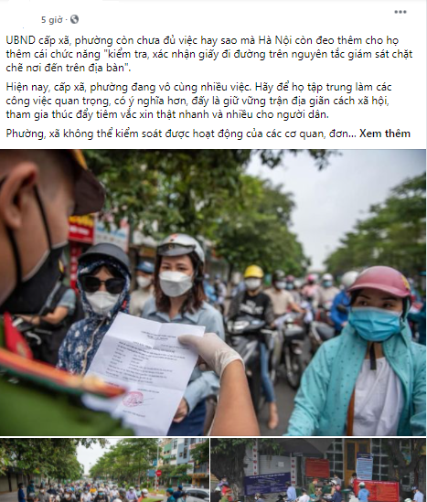 Tuy nhiên bây giờ giấy đi đường mới thì rất phức tạp, lại kèm theo rất nhiều thủ tục, lại phải bố trí thêm người ngồi tiếp công dân tại trụ sở. Cùng với đó, là phải bố trí nhân sự để tuần tra, giám sát rồi trực chốt tại các điểm phong tỏa khiến cán bộ phường vẫn phải căng mình làm việc và không thể tránh được việc tiếp xúc với người dân đến xin xác nhận.