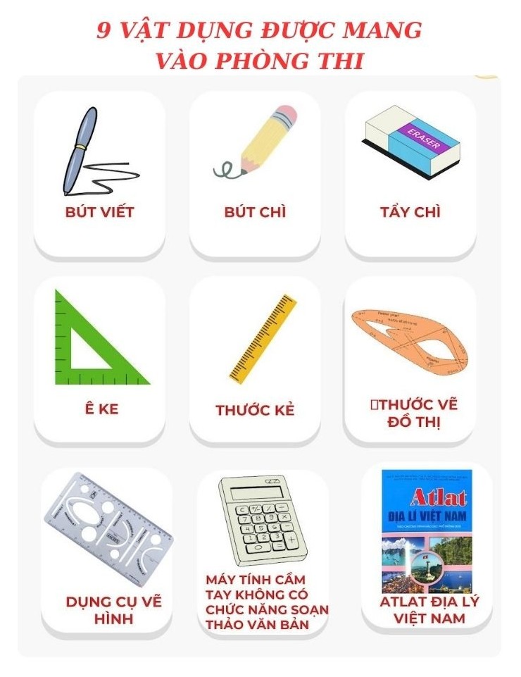 (1) Được mang vào phòng thi: Bút viết; thước kẻ; bút chì; tẩy chì; êke; thước vẽ đồ thị; dụng cụ vẽ hình; máy tính cầm tay không có chức năng soạn thảo văn bản, không có thẻ nhớ; Atlat Địa lí Việt Nam được biên soạn theo Chương trình giáo dục phổ thông 2006 (không có đánh dấu hoặc viết thêm bất cứ nội dung nào khác).