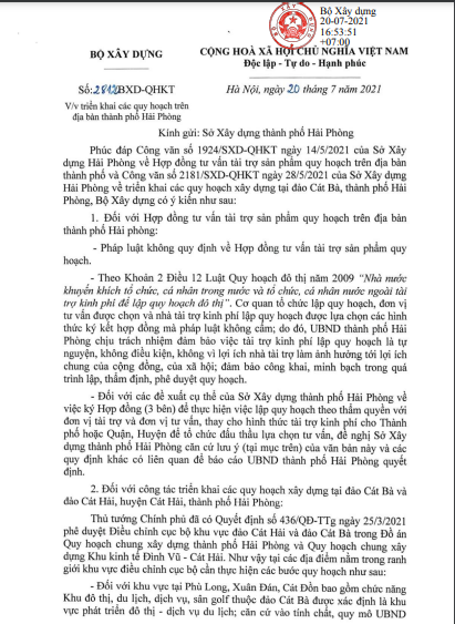 Mới đây, Bộ Xây dựng đã có công văn 2812/BXD-QHKT gửi Sở Xây dựng Hải Phòng về Hợp đồng tư vấn tài trợ sản phẩm quy hoạch trên địa bàn thành phố và việc triển khai các quy hoạch xây dựng tại đảo Cát Bà.