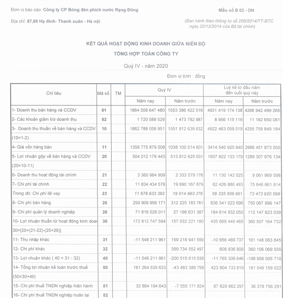 CTCP Bóng đèn Phích nước Rạng Đông (MCK: RAL) đã công bố báo cáo tài chính hợp nhất quý IV/2020 ghi nhận sự tăng trưởng trong kết quả kinh doanh.