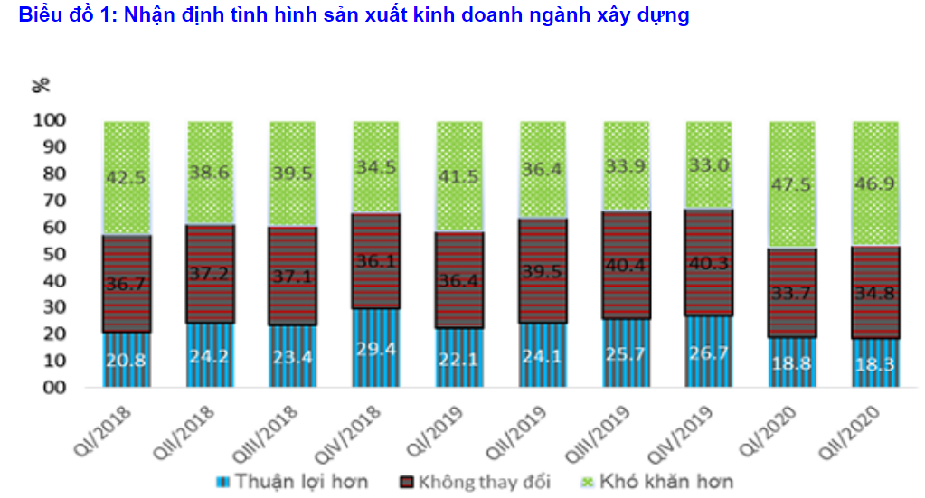 Dự báo quý II/2020, doanh nghiệp xây dựng công trình kỹ thuật dân dụng nhận định khả quan hơn so với các ngành còn lại với 19,9% dự báo tốt hơn, 35,3% dự báo giữ ổn định và 44,8% khó khăn hơn; tỷ lệ này của doanh nghiệp xây dựng nhà các loại là 19,2% tốt hơn, 33,0% giữ ổn định và 47,8% khó khăn hơn; doanh nghiệp hoạt động xây dựng chuyên dụng có 14,3% tốt hơn, 37,4% giữ ổn định và 48,3% khó khăn hơn.