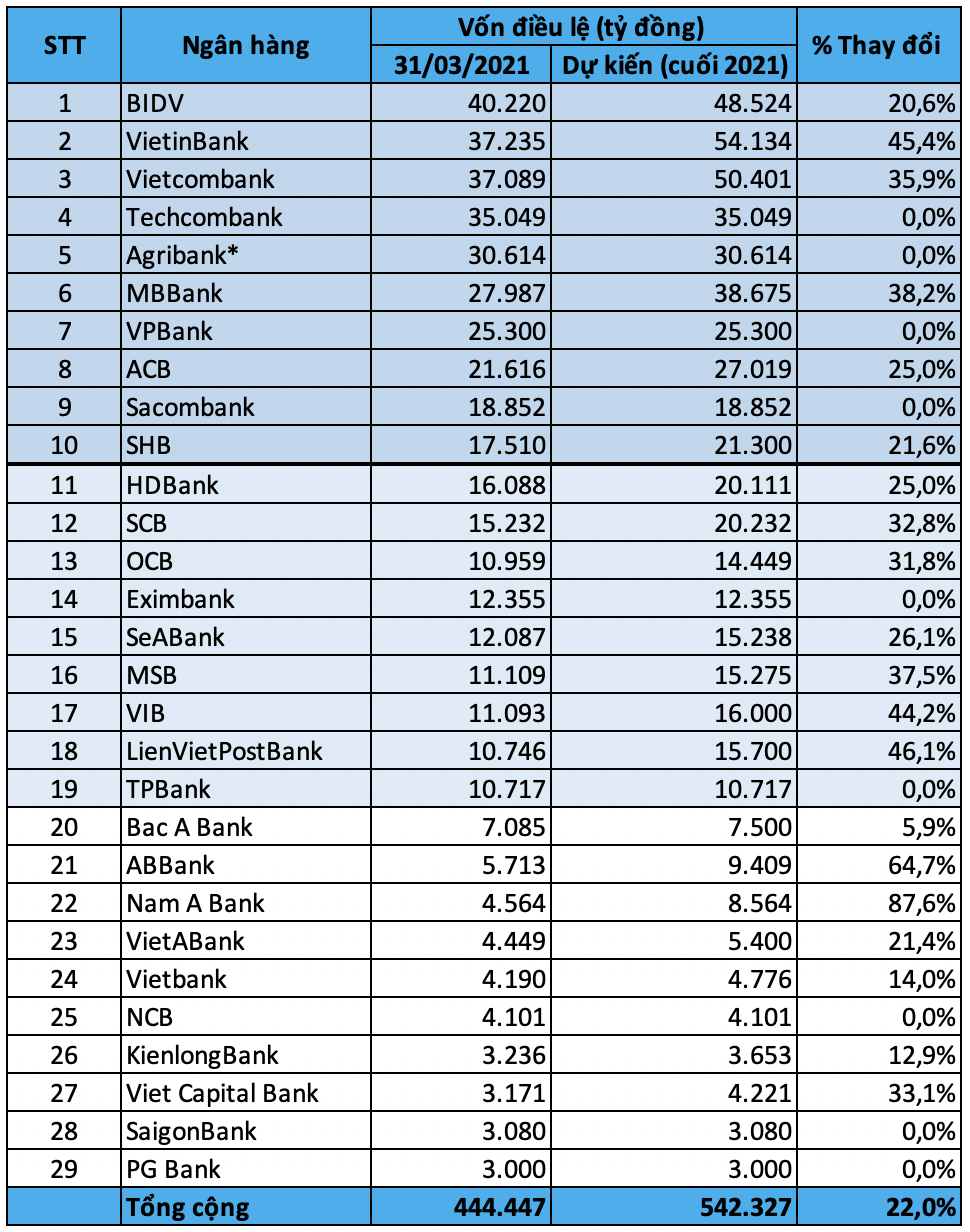 Cụ thể, theo thống kê từ báo cáo tài chính của 29 ngân hàng trong nước, tính đến hết ngày 31/3, tổng vốn điều lệ các ngân hàng đạt khoảng 444.447 tỉ đồng, không có sự thay đổi nào so với cuối năm 2020.