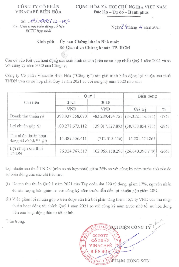 Giải trình số liệu BCTC hợp nhất quý I/2021 của VCF. Nguồn: HoSE.