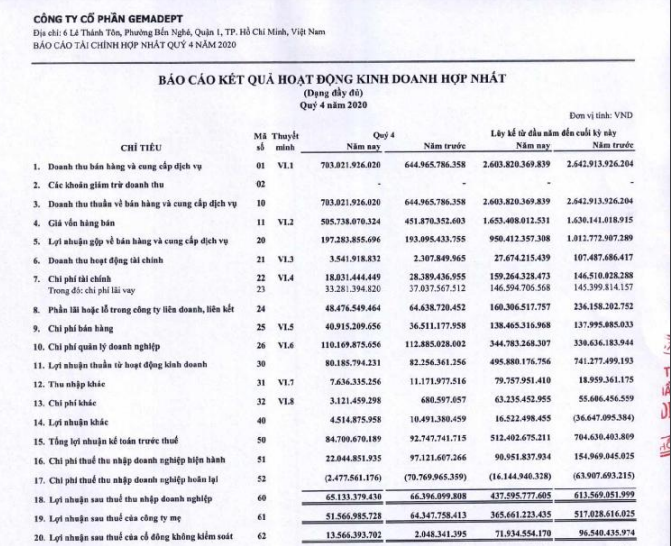 Luỹ kế năm 2020, Gemadept ghi nhận doanh thu đạt 2.603,8 tỷ đồng, lợi nhuận sau thuế đạt 437,6 tỷ đồng, lần lượt bằng 98,5% và 71,3% thực hiện trong năm 2019.