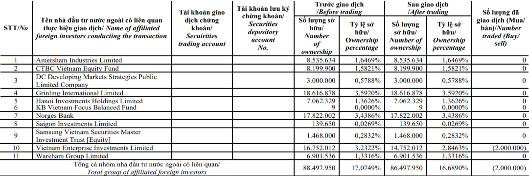 Sau giao dịch, Vietnam Enterprise Investments Limited giảm sở hữu từ 3,2% còn 2,8% vốn điều lệ, còn tỷ lệ của cả nhóm Dragon Capital giảm từ 17% còn gần 16,7%, tương đương nắm giữ tổng cộng gần 86,5 triệu cổ phiếu DXG của Tập đoàn Đất Xanh.
