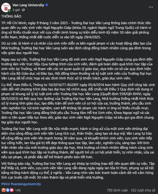 Bài đăng nêu rõ sự việc là hành vi cá nhân của sinh viên diễn ra bên ngoài phạm vi các hoạt động đào tạo của Nhà trường, Trường Đại học Văn Lang luôn xác định cộng đồng trách nhiệm cùng gia đình trong việc giáo dục người học.
