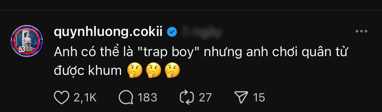 Mới đây, diễn viên Quỳnh Lương thu hút sự chú ý khi đăng một dòng trạng thái đầy ẩn ý trên Threads: "Anh có thể là 'trap boy' nhưng anh chơi quân tử được không".