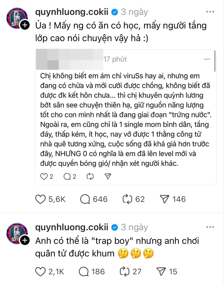 Theo đó, một tài khoản đã để lại comment: "Chị không biết em ám chỉ ViruSs hay ai nhưng em đang có chửa và mới cưới được chồng, không biết đã được đăng ký kết hôn chưa thì chị khuyên Quỳnh Lương bớt sân si chuyện thiên hạ, giữ nguồn năng lượng tốt cho con mình. Em cũng chỉ là single mom bình dân, tầng đáy, thấp kém, ít học, nay vớ được 1 công tử nhà quê tương xứng, cuộc sống đã khá giả hơn trước nhưng không có nghĩa là đã lên level mới và được quyền bóng gió/ nhận xét người khác".