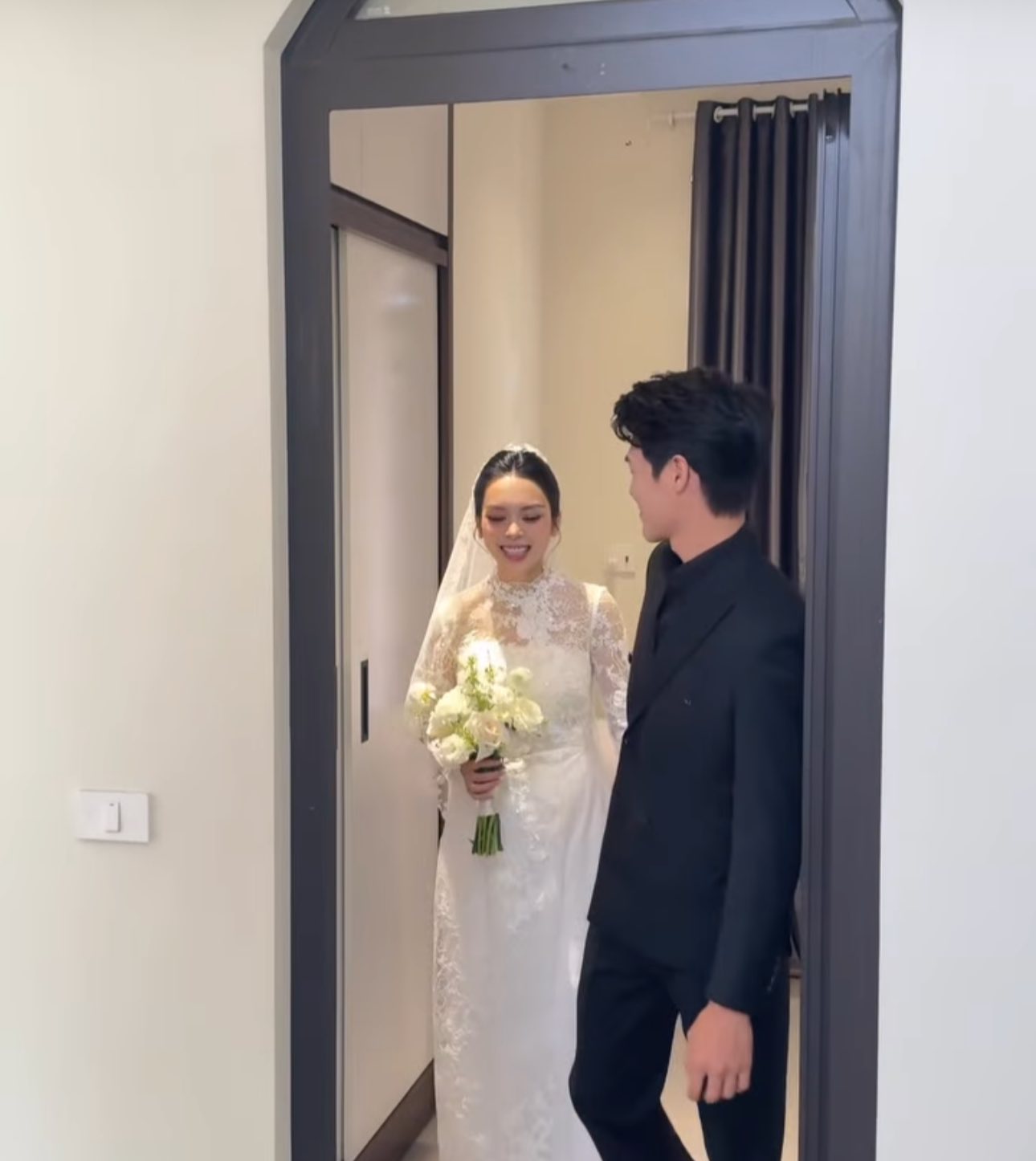 Trong khi đó, Quỳnh Lương nhẹ nhàng và khép nép bên chồng. Người đẹp cũng thường xuyên bị bắt gặp trong trạng thái cầm hoa cưới khéo che chắn vùng bụng. Có thể thấy dù đã công khai việc mang bầu, song Quỳnh Lương vẫn tỏ ra cẩn thận, tránh gây sự chú ý trong ngày trọng đại.