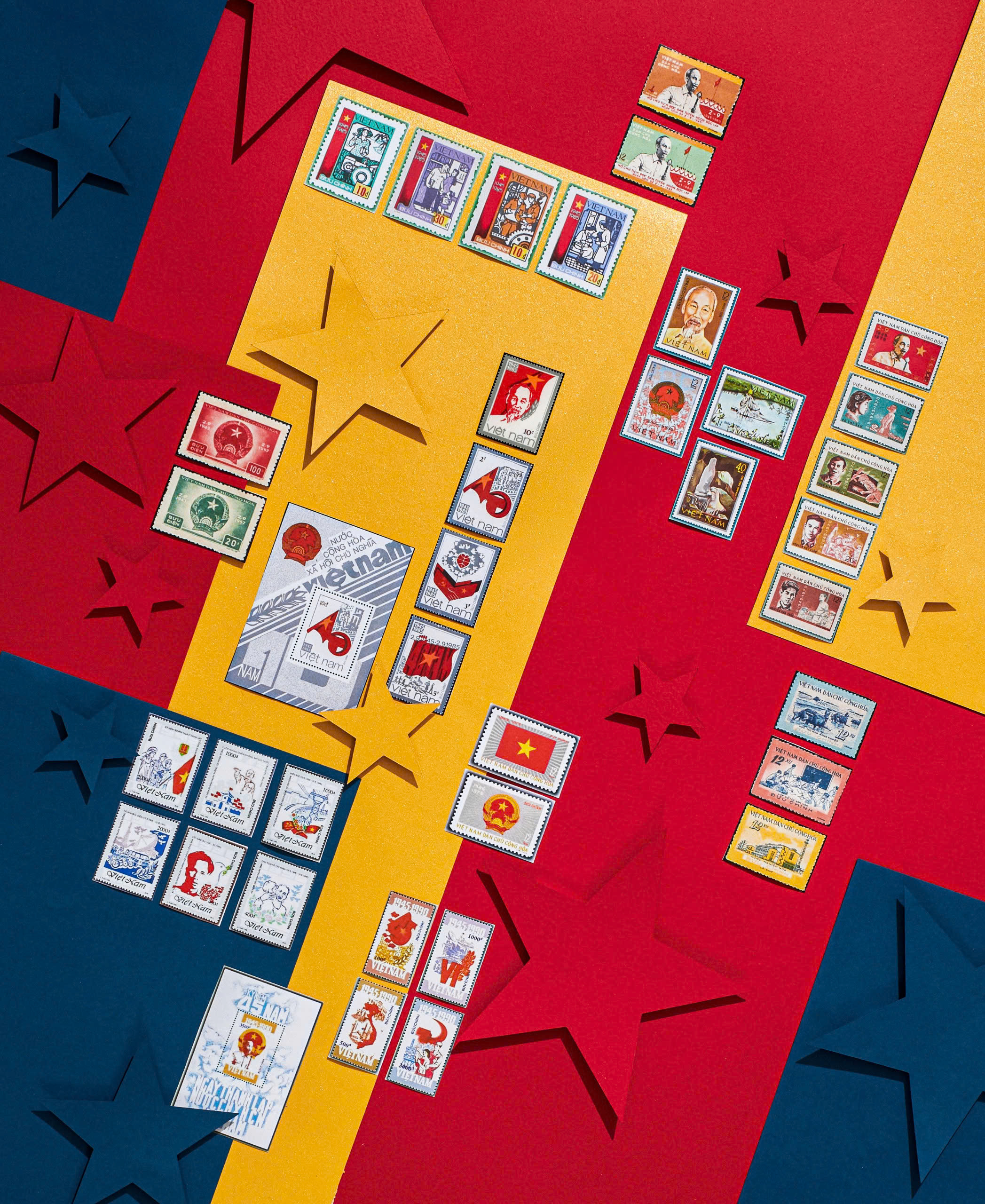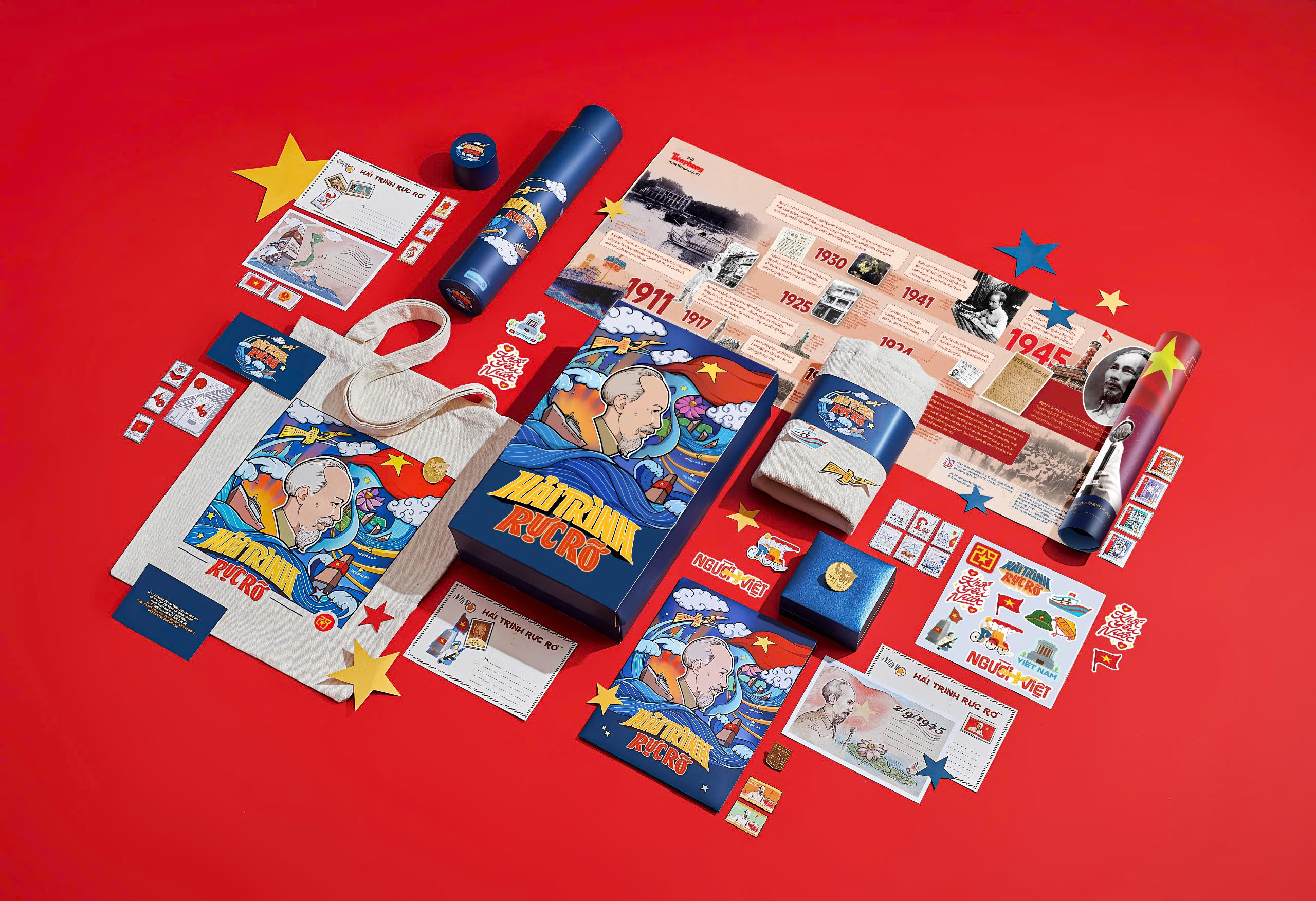 Cùng với infographic, Hải trình rực rỡ được phát triển thành bộ ấn phẩm giới hạn gồm: túi tote in họa tiết chân dung Bác Hồ; bộ 5 postcard gợi nhắc những địa danh lịch sử; bộ sưu tập tem “Mở lối” được tuyển chọn tinh túy từ kho lưu trữ quý giá của Công ty Tem Việt Nam, đưa bạn đi qua những cột mốc 2/9 vàng son của đất nước từ thập niên 50 đến những năm đổi mới. Mỗi bộ tem là một tác phẩm độc bản, lưu giữ những câu chuyện lịch sử và giá trị thẩm mỹ của từng thời kỳ. Vì tính chất duy nhất, không phát hành lại của các bộ tem nên đây là cơ hội hiếm có để bạn sở hữu một báu vật văn hóa mang niềm tự hào dân tộc.
