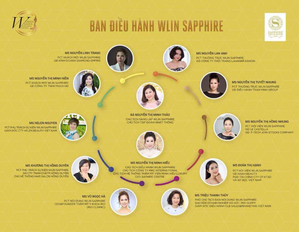 Tổ chức Wlin Sapphire do nữ doanh nhân Nguyễn Thị Minh Thảo – Chủ tịch Tập đoàn Nhất Thống, làm Chủ tịch sáng lập Wlin Sapphire và nữ doanh nhân Nguyễn Thị Minh Hiếu – Chủ tịch MHC International, Chủ tịch Hệ Thống Thẩm Mỹ Viện Minh Hiếu Luxury, là Chủ tịch điều hành Wlin Sapphire cùng 10 Phó chủ tịch Wlin Sapphire là các nữ doanh nhân nổi tiếng thuộc các lĩnh vực khác nhau.