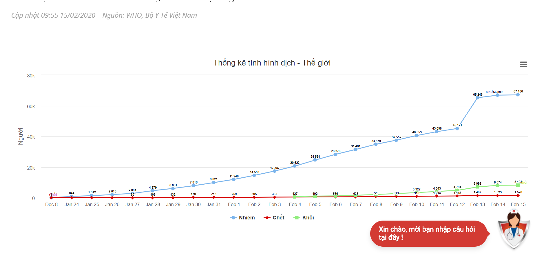 Số liệu được cập nhật tự động liên tục từ thông tin công bố của Tổ chức Y tế thế giới (WHO), Cổng TTĐT Bộ Y tế...