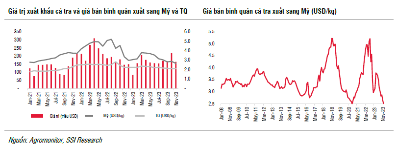 Đối với ngành cá tra, nhìn lại chu kỳ trước, SSI quan sát thấy giá bán trung bình phải mất từ 1,5-2 năm để chạm đáy và mất khoảng 4 năm để đi hết chu kỳ. Do đó, nhóm phân tích kỳ vọng giá bán trung bình của cá tra có thể tăng trở lại trong nửa cuối năm 2024 (hai năm từ đỉnh xuống đáy).