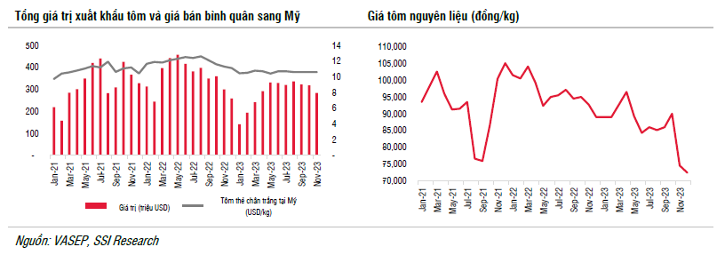 Trong 11 tháng đầu năm 2023, kim ngạch xuất khẩu thủy sản Việt Nam đạt 8,2 tỷ USD (giảm 20% so với cùng kỳ), trong đó xuất khẩu tôm và cá tra lần lượt đạt 3,1 tỷ USD (giảm 23% so với cùng kỳ) và 1,7 tỷ USD (giảm 27% so với cùng kỳ). Chúng tôi lưu ý rằng tốc độ giảm của xuất khẩu thủy sản đã giảm dần kể từ quý 2/2023, tuy nhiên không ghi nhận mức tăng trưởng đáng kể và giá bán trung bình so với năm trước vẫn đang suy giảm.