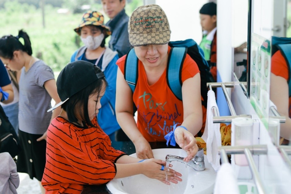 Các bạn nhỏ được bố mẹ hướng dẫn rửa tay cẩn thận trước khi vào tham quan Trang trại