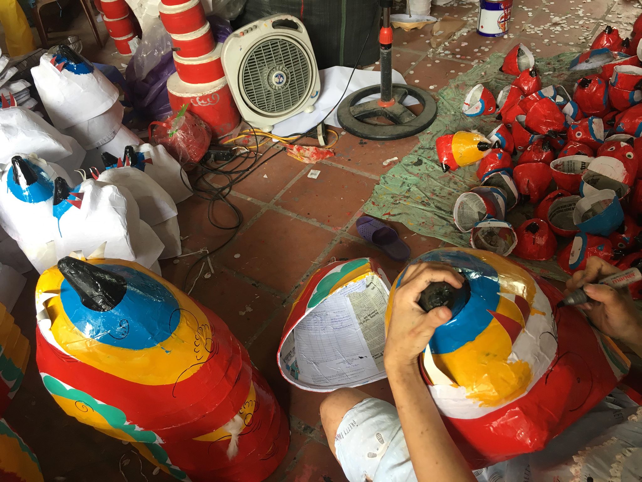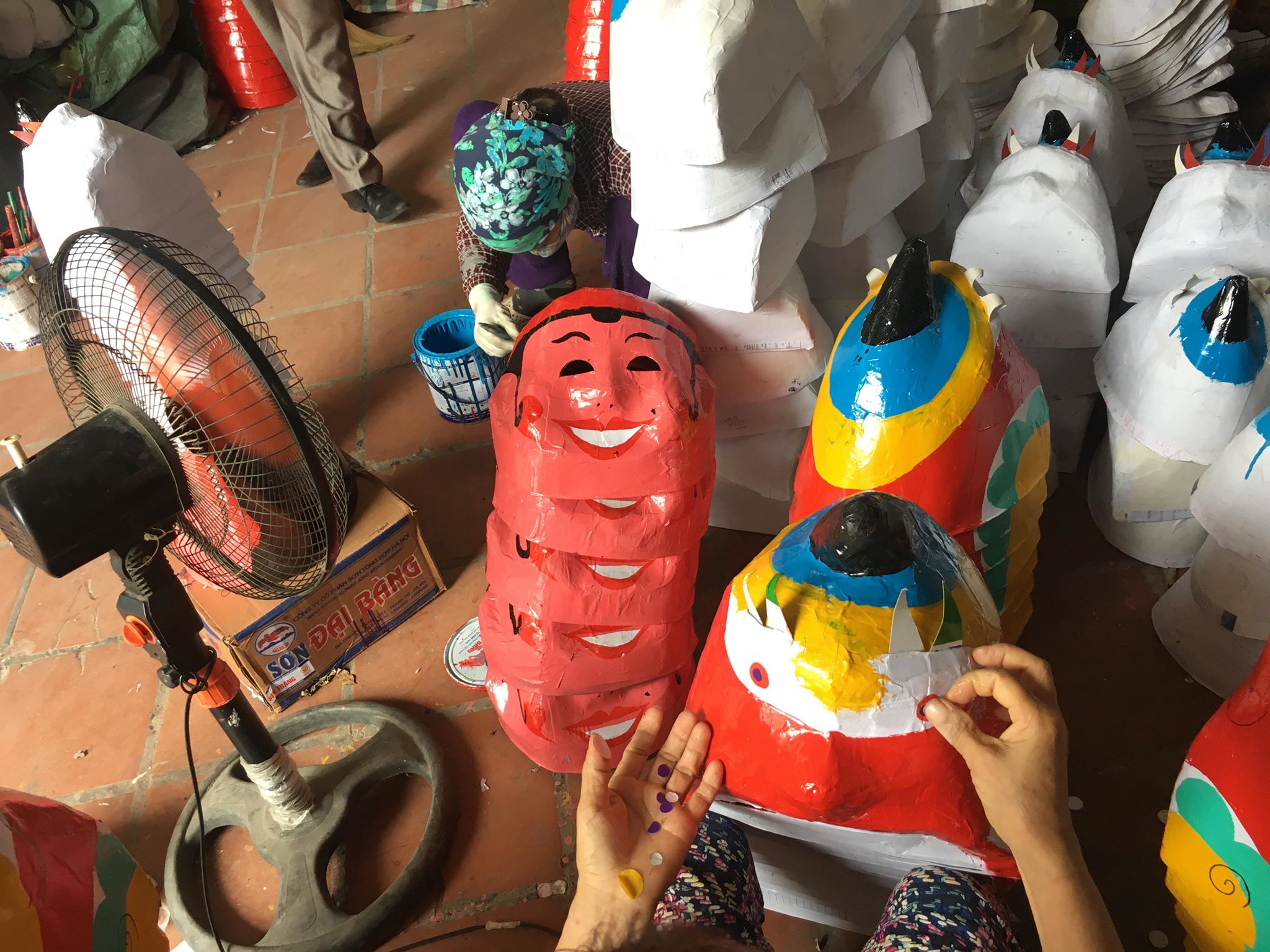 | Một người thợ đang sơn đầu sư tử. Để làm hoàn thiện một chiếc đầu sư tử cần phải qua nhiều quy trình như: tạo hình, sơn, vẽ,... |