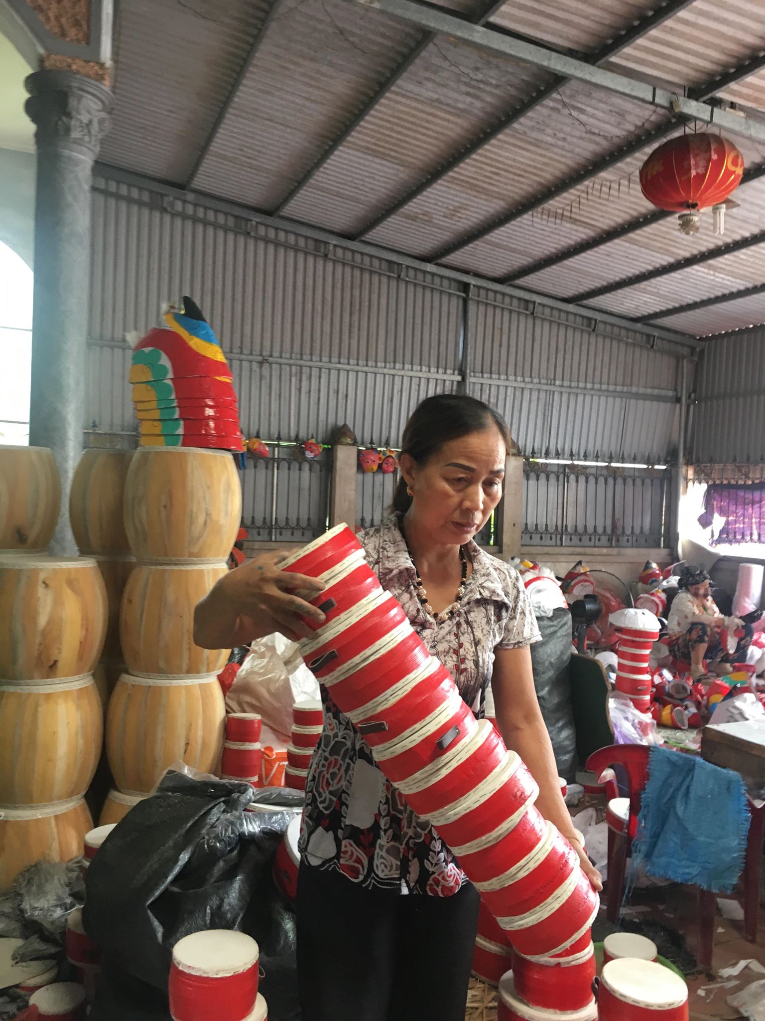 Bà Thoàn cho biết thêm: "Riêng trống thì có rất nhiều loại to nhỏ khác nhau. Loại nhỏ nhất có giá 12.000 đồng/chiếc, loại to nhất có giá 200.000 đồng/chiếc. Mặt trống được làm từ da trâu, tang trống được làm từ gỗ mỡ, gỗ bồ đề,..."