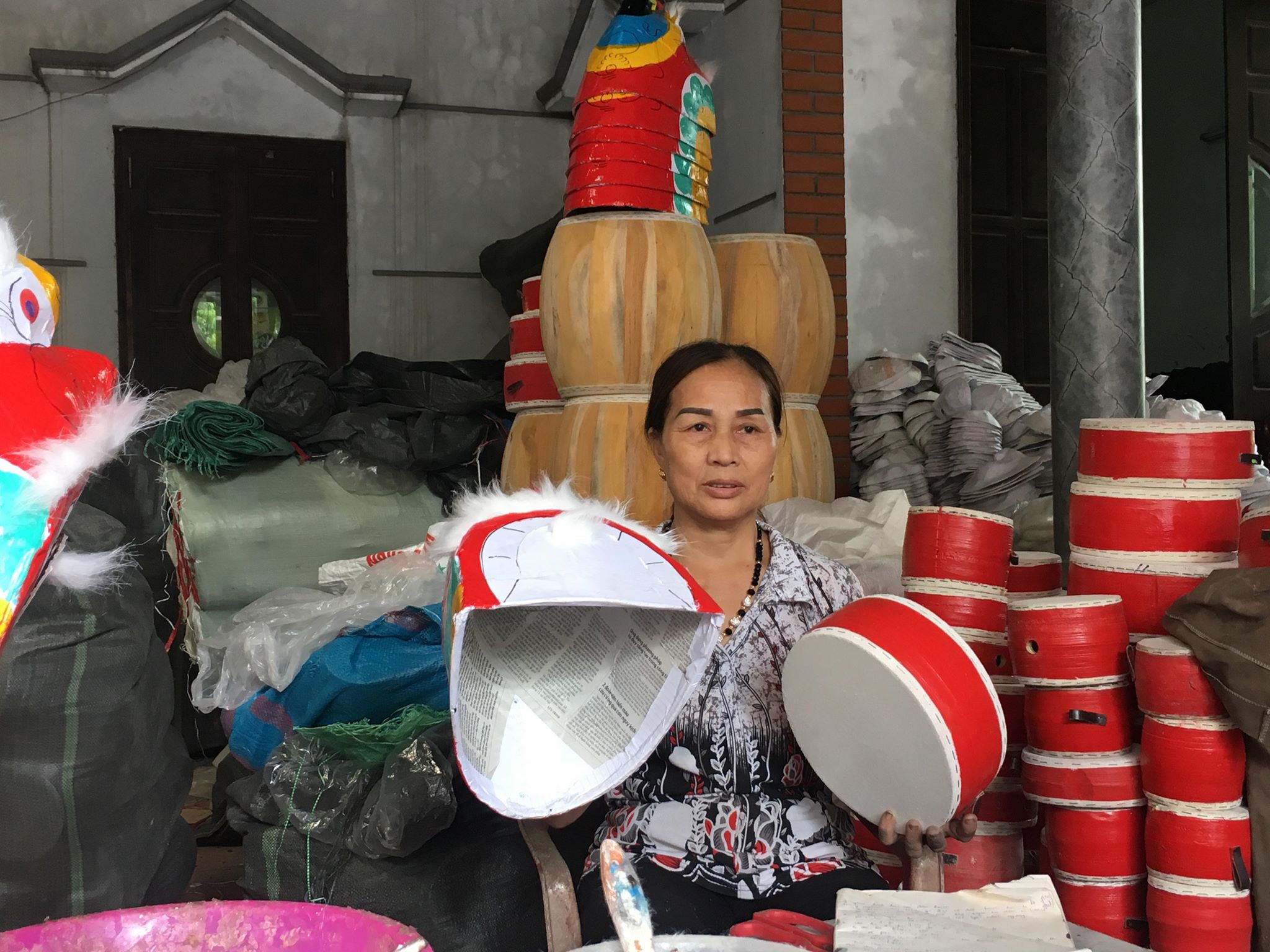 Bà Thoàn, một người gắn bó với nghề gần 50 năm trải lòng: "Nghề này là nghề truyền thống của gia đình cũng như cả ngôi làng này. Nghề này có từ hơn trăm năm trước, còn với bản thân thì đã gắn bó với nghề này được gần 50 năm rồi. Cho đến nay, gia đinh vẫn sản xuất các sản phẩm phục vụ dịp Tết Trung thu như trống, mặt nạ, đầu sư tử,..."
