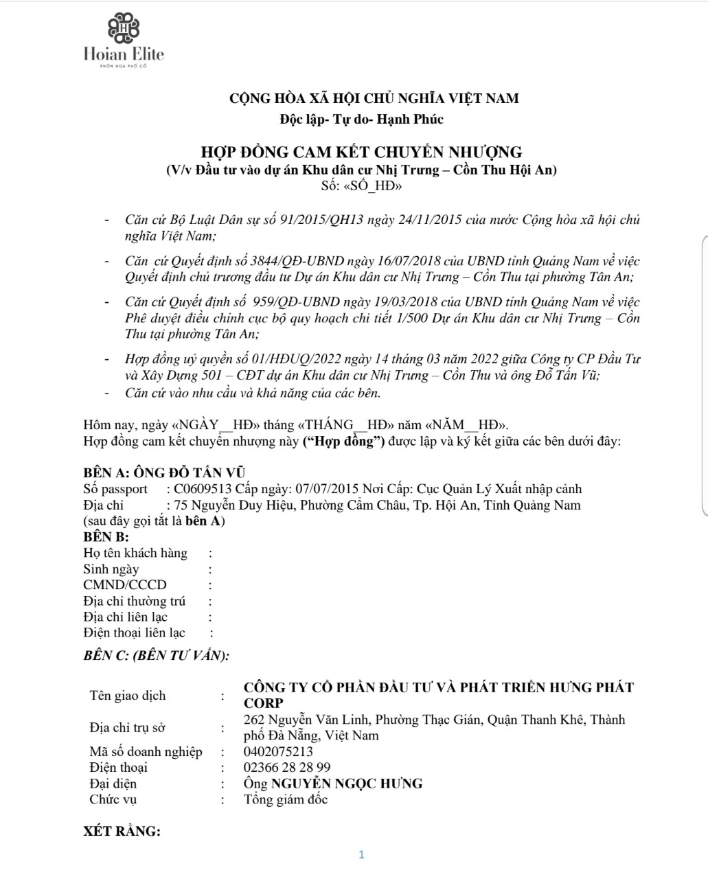 Hợp đồng cam kết chuyển nhượng khách hàng sẽ ký với ông Đỗ Tấn Vũ khi mua đất tại dự án Hoian Elite