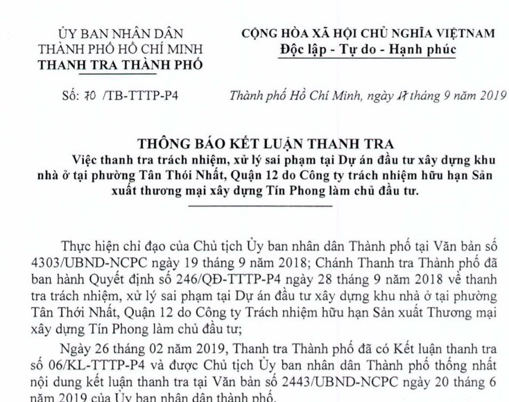Thanh tra TPHCM vừa thông báo kết luận 70/TB-TTTP-P4, theo đó Thanh tra Thành phố HCM kiến nghị xử lý sai phạm tại Dự án đầu tư xây dựng khu nhà ở tại phường Tân Thới Nhất (Quận 12) do Công ty TNHH Sản xuất thương mại xây dựng Tín Phong làm chủ đầu tư.