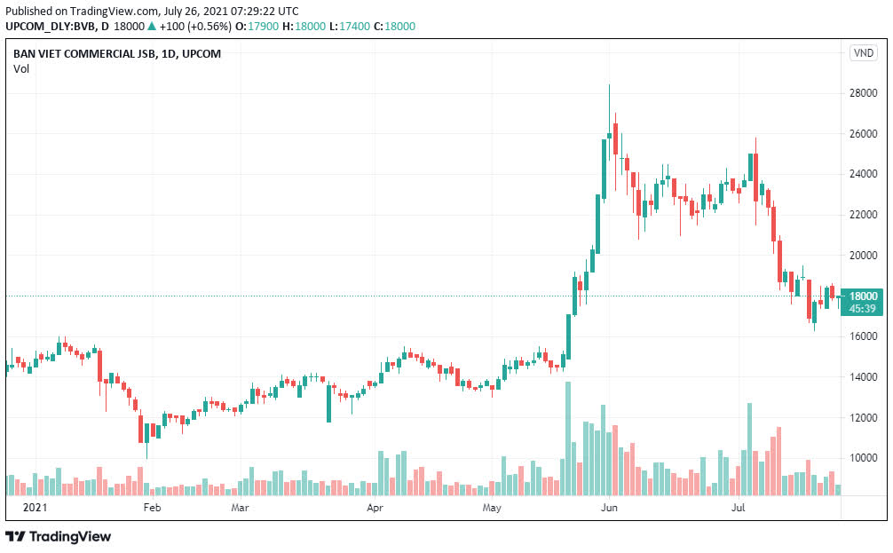 Trên thị trường, chốt phiên giao dịch ngày 26/7, giá cổ phiếu BVB giảm 1,1% xuống còn 17.900 đồng/cp.