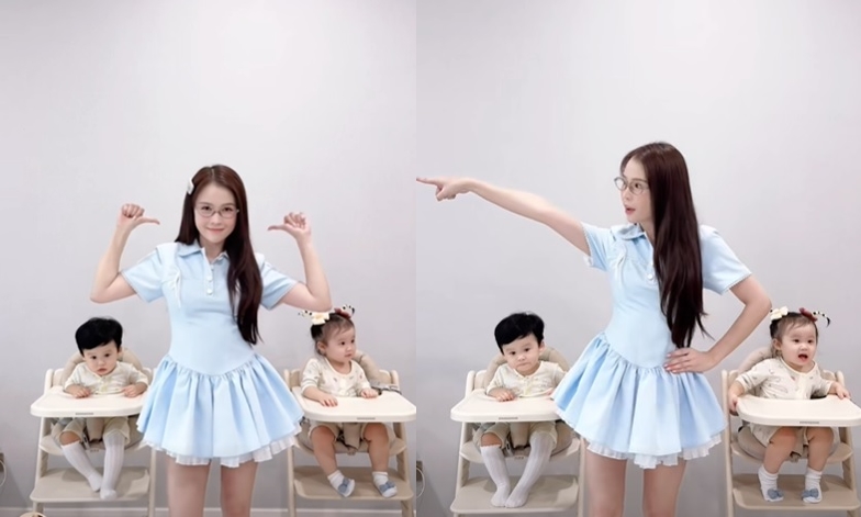 Mới đây, Sam đăng tải một đoạn video ngắn cùng hai con lên trang cá nhân. Trong đó, người đẹp diện chiếc váy xanh nữ tính, nhảy nhót đầy năng lượng theo điệu nhạc.