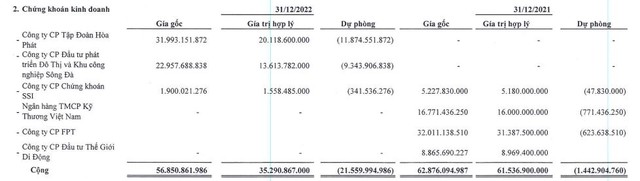Tại ngày 31/12/2022, Samland có 56,9 tỷ đồng chứng khoán kinh doanh. Samland nắm giữ 3 cổ phiếu là HPG của Công ty Cổ phần Tập đoàn Hòa Phát (giá gốc 32 tỷ đồng), Công ty Cổ phần Đầu tư phát triển đô thị Sông Đà (giá gốc gần 23 tỷ đồng) và cổ phiếu SSI của Công ty Chứng khoán SSI (giá gốc 1,9 tỷ đồng). Chính vì chứng khoán thua lỗ nên hồi cuối năm 2022, trong tài khoản của Samland chỉ có… 1 tỷ đồng tiền và các khoản tương đương tiền.