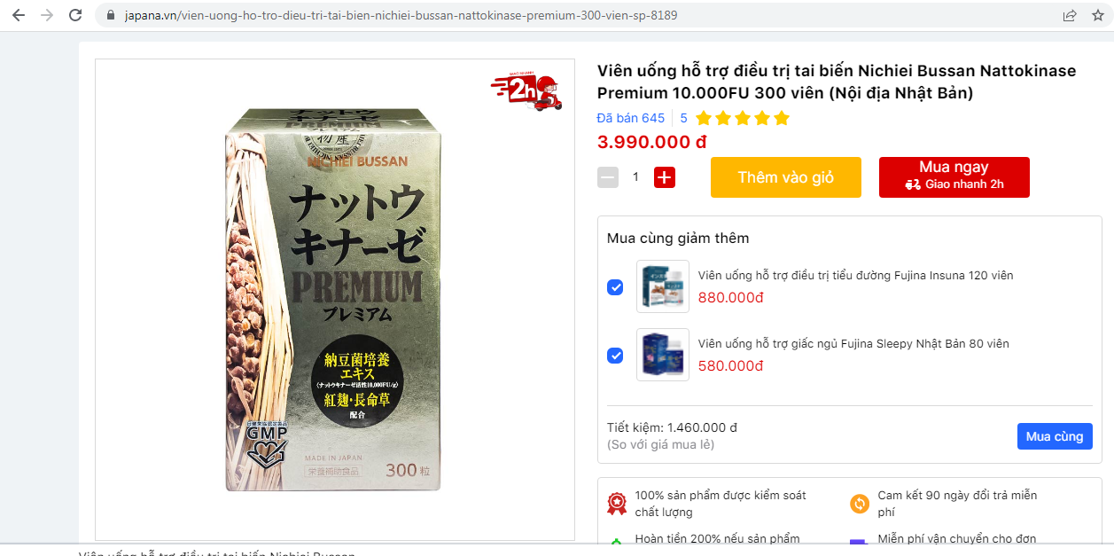 Theo tìm hiểu của phóng viên trên website có địa chỉ https://japana.vn/vien-uong-ho-tro-dieu-tri-tai-bien-nichiei-bussan-nattokinase-premium-300-vien-sp-8189, Nattokinase Premium được giới thiệu là sản phẩm chất lượng được sản xuất theo công nghệ tiên tiến của Nhật Bản, đảm bảo tiêu chuẩn cao cấp và chất lượng hàng đầu. Đồng thời, cũng giúp cơ thể hấp thu tốt hàm lượng Nattokinase 1200FU mỗi ngày, mang đến hiệu quả nhanh chóng.