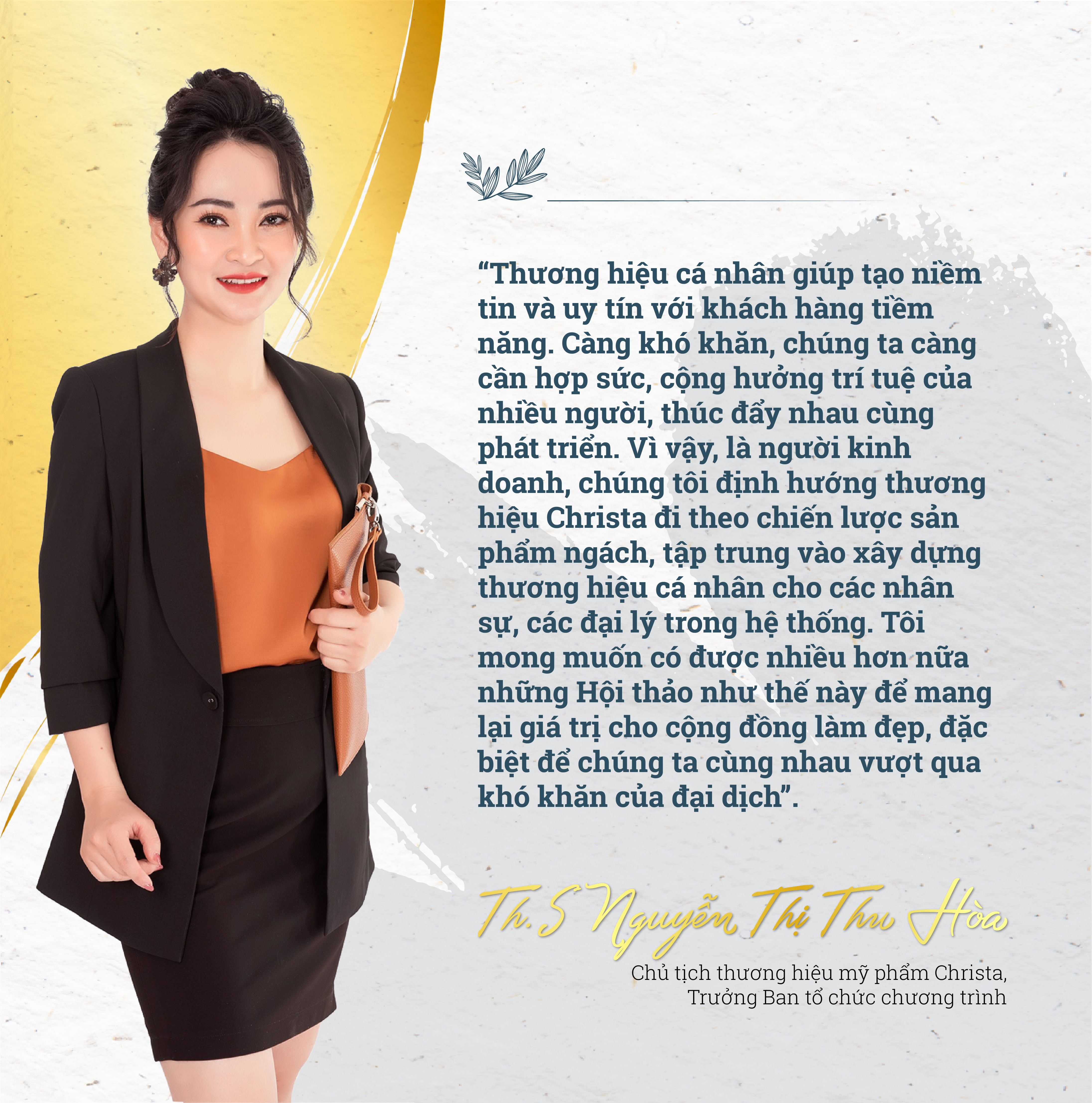 Phát biểu cuối Hội thảo, bà Thu Hòa – Chủ tịch thương hiệu mỹ phẩm Christa, Trưởng Ban tổ chức chương trình bày tỏ mong muốn trong thời gian tới sẽ có thêm nhiều hội thảo, tọa đàm mang lại những giá trị chân thành, giúp đỡ cho nhiều chủ spa và cộng đồng làm đẹp vượt qua những khó khăn của đại dịch Covid-19 cũng như tìm ra sự khác biệt, định vị thương hiệu bền vững trong ngành làm đẹp./.