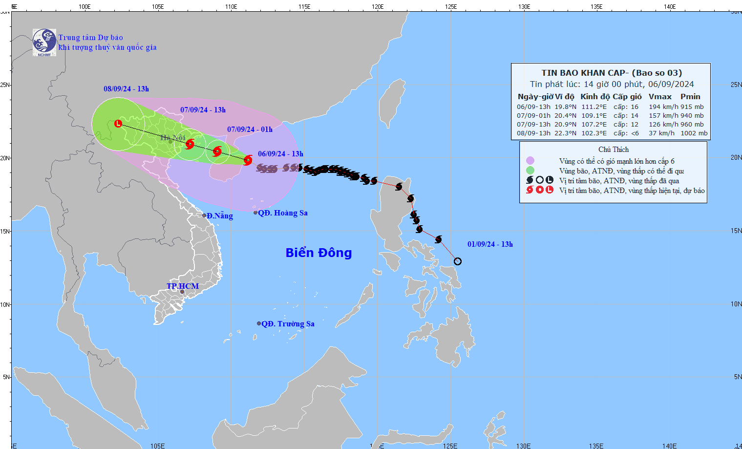 Theo Trung tâm Dự báo khí tượng thủy văn quốc gia, hồi 13 giờ ngày 06/9, vị trí tâm bão số 3 ở vào khoảng 19,8 độ Vĩ Bắc; 111,2 độ Kinh Đông, trên vùng biển phía Đông Bắc đảo Hải Nam (Trung Quốc); cách Quảng Ninh khoảng 450km về phía Đông Đông Nam. Sức gió mạnh nhất vùng gần tâm bão mạnh cấp 16 (184-201km/h), giật trên cấp 17, di chuyển theo hướng Tây Tây Bắc, tốc độ 15-20km/h.