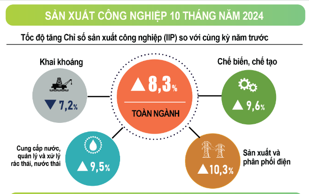 Tính chung mười tháng năm 2024, IIP ước tính tăng 8,3% so với cùng kỳ năm trước (cùng kỳ năm 2023 tăng 0,5%). Trong đó, ngành chế biến, chế tạo tăng 9,6% (cùng kỳ năm 2023 tăng 0,5%), đóng góp 8,3 điểm phần trăm vào mức tăng chung; ngành sản xuất và phân phối điện tăng 10,3%, đóng góp 0,9 điểm phần trăm; ngành cung cấp nước, hoạt động quản lý và xử lý rác thải, nước thải tăng 9,5%, đóng góp 0,2 điểm phần trăm; riêng ngành khai khoáng giảm 7,2%, làm giảm 1,1 điểm phần trăm trong mức tăng chung.
