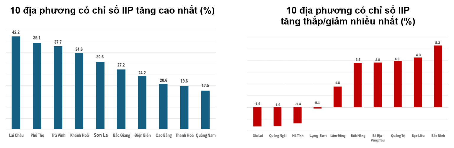 Chỉ số sản xuất công nghiệp mười tháng năm 2024 so với cùng kỳ năm trước tăng ở 59 địa phương và giảm ở 04 địa phương trên cả nước. Một số địa phương có chỉ số IIP đạt mức tăng khá cao do ngành công nghiệp chế biến, chế tạo; ngành sản xuất và phân phối điện; ngành khai khoáng tăng cao. Ở chiều ngược lại, một số địa phương có chỉ số IIP tăng thấp hoặc giảm do ngành công nghiệp chế biến, chế tạo và ngành sản xuất, phân phối điện tăng thấp hoặc giảm.