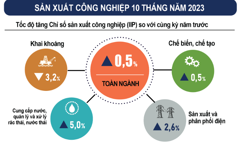 Tính chung 10 tháng năm 2023, IIP ước tính tăng 0,5% so với cùng kỳ năm trước (cùng kỳ năm 2022 tăng 8,9%). Trong đó, ngành chế biến, chế tạo tăng 0,5% (cùng kỳ năm 2022 tăng 9,5%), đóng góp 0,7 điểm phần trăm vào mức tăng chung; ngành sản xuất và phân phối điện tăng 2,6%, đóng góp 0,2 điểm phần trăm; ngành cung cấp nước, hoạt động quản lý và xử lý rác thải, nước thải tăng 5%, đóng góp 0,1 điểm phần trăm; ngành khai khoáng giảm 3,2%, làm giảm 0,5 điểm phần trăm trong mức tăng chung.
