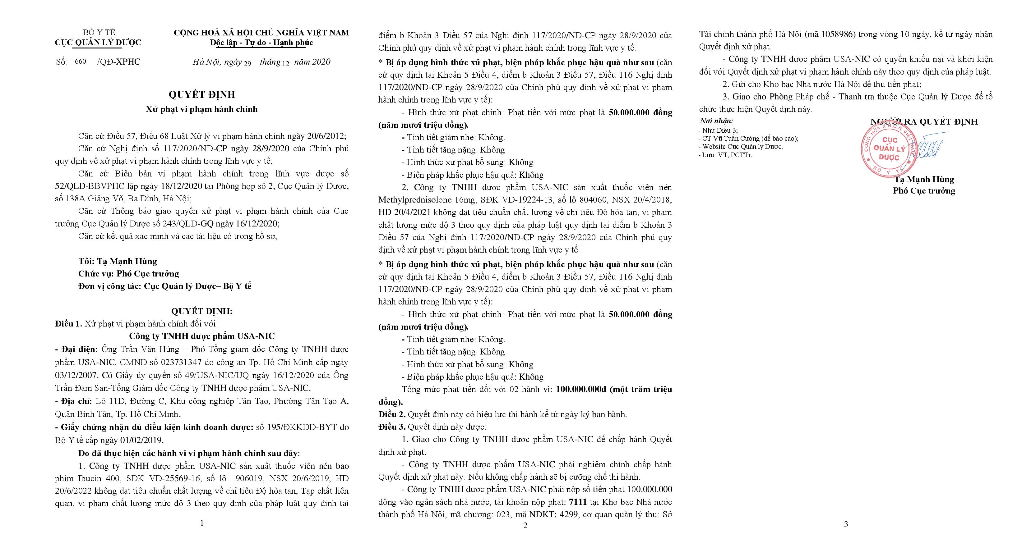 Đến ngày 29/12/2020, căn cứ Biên bản vi phạm hành chính trong lĩnh vực dược số 52/QLD-BBVPHC, Phó Cục trưởng – Cục Quản lý Dược ký quyết định số 660/QĐ-XPHC về việc xử phạt vi phạm hành chính đối với Dược phẩm USA-NIC.